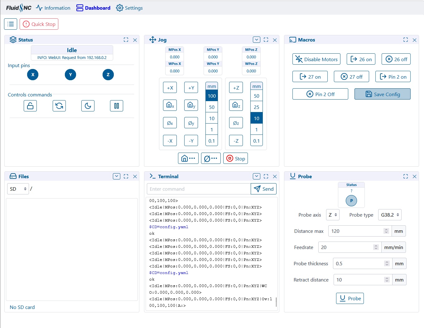 This Interface is from the ESP3D WebUI project. This interface allows for wireless machine jogging, custom macros, quick buttons for any of the Jackpot’s outputs, terminal control, file system control, UI and board configs, all in one place. You can update the firmware, GUI, and board settings all from the WebUI.You can wirelessly transfer your gcode files, but manually using the MicroSD card is still preferred. Most will probably never even plug the USB port in. This can be used from most any device that has a web browser. If you are using a small touchscreen you can even zoom in so the buttons are easier to hit.