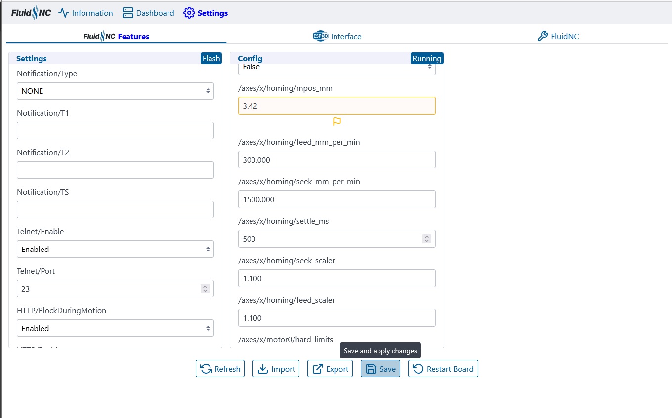 FluidNC Firmware - The Current tested and confirmed FluidNC version is 3.9.9, and WebUI V3, use anything newer than this with caution. Take note of all your pull off values to keep things level and square after an update.